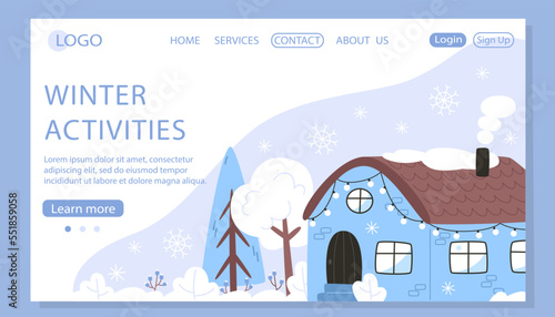 Vector set of recreation posters, banners. Winter countryside and mountain peak with waterfall landscapes backgrounds. Advertising flat style design elements.