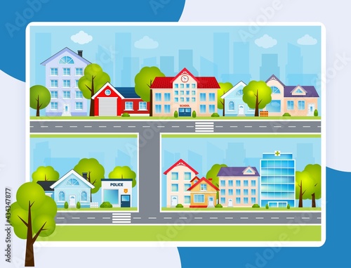 Vector set of school building interior concept design elements in flat style. Classroom at school, university, college with furniture, chalkboard, training appliances. Locker, school bus.