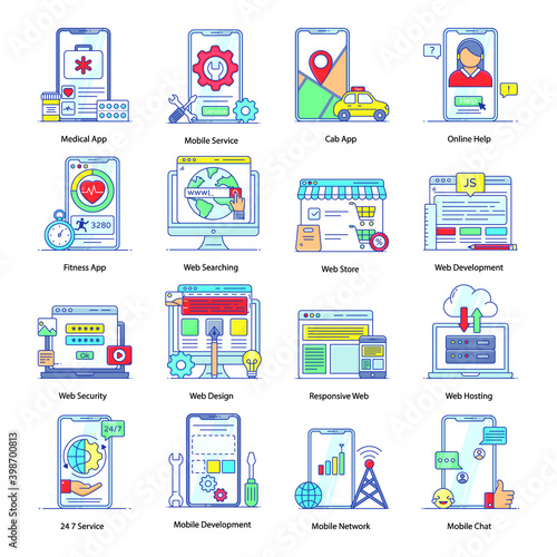 Vector set of SEO optimization and digital internet marketing. Online services, cloud storage and social media networks. icons in thin line style. Website UI and mobile web app icon.