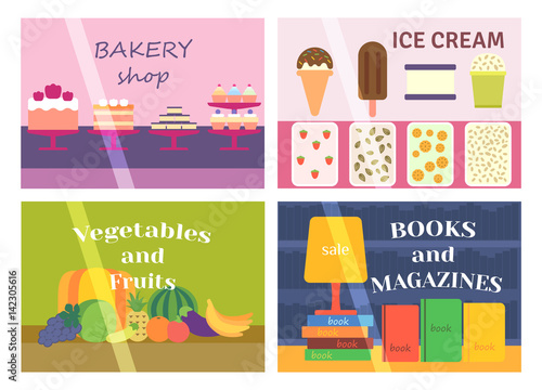 Vector set of shops horizontal banners. Jewelry shop, Pastry cafe and Furniture store flat style design elements.