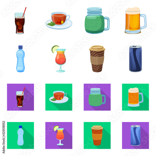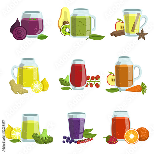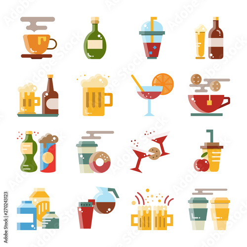 Vector set of soft drinks. Fresh milk, juicy lemonade, sweet soda and mineral water. Popular nonalcoholic beverages. Flat design