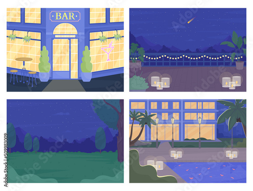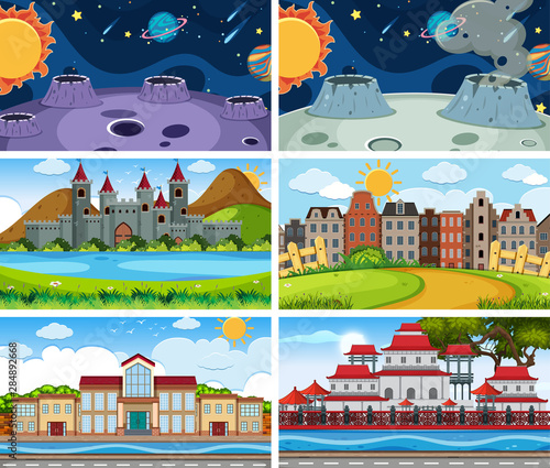 Vector set of space interior posters, banners. The Moon surface, lunar roving vehicles, classroom interior and scientific laboratory with lab equipment flat style design elements.