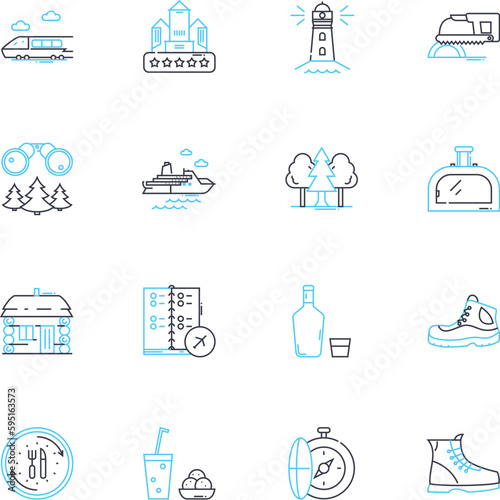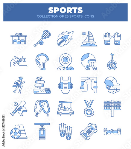Vector set of sport icons in thin line style. Volleyball, lacrosse, skiing, fencing, golf, backpack. Website UI and mobile web app icon. Outline design illustration