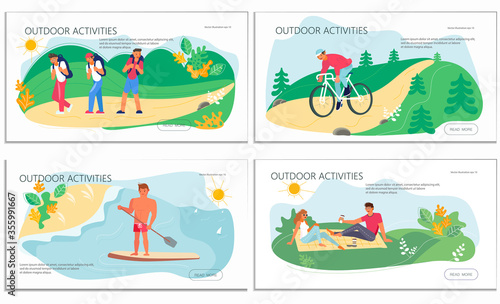 Vector set of summer outdoor activities concept posters, banners. Diving, Badminton, Frisbee and Camping design elements in flat style.