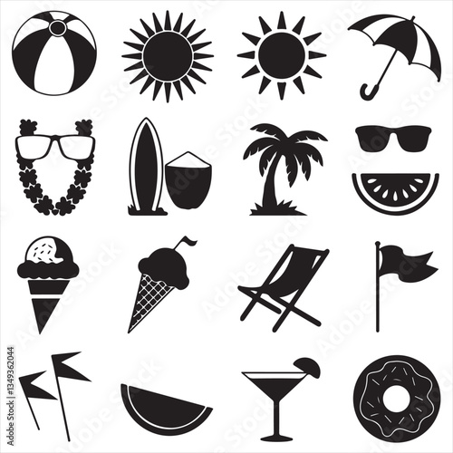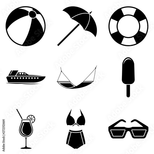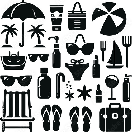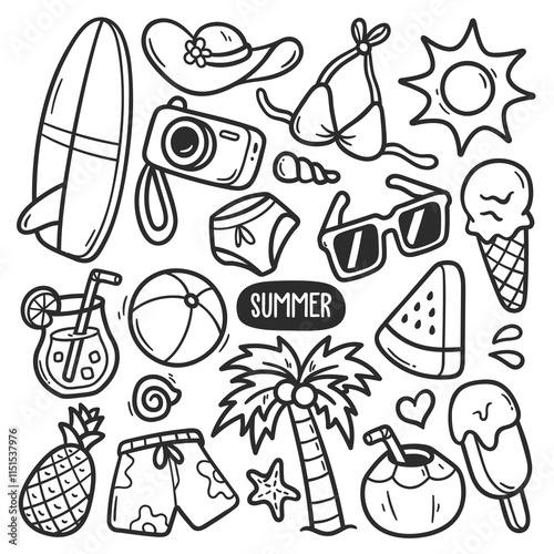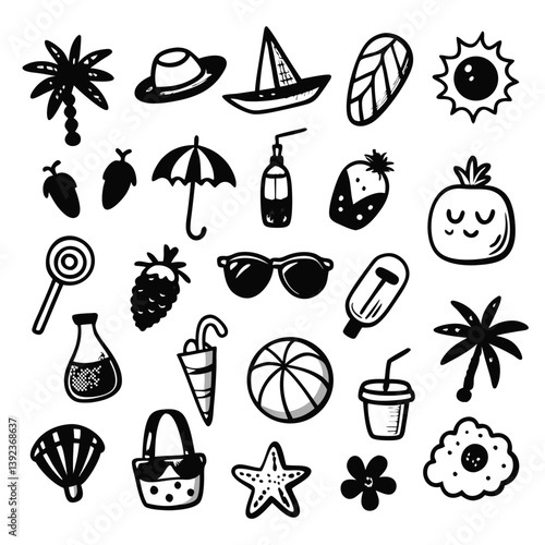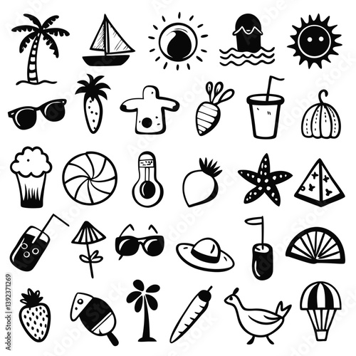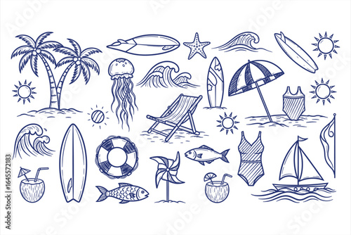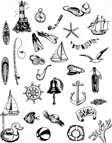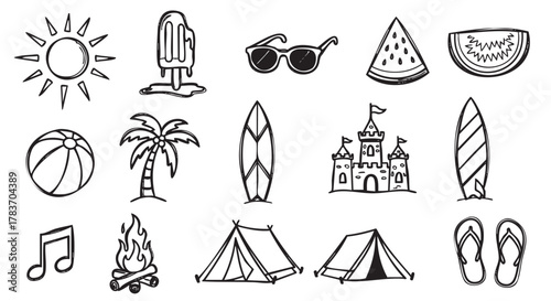 Vector set of summer season objects in vintage style. Design elements, icons isolated on white background. Summer camp, beach holidays, tropical sea vacations. - stock vector
