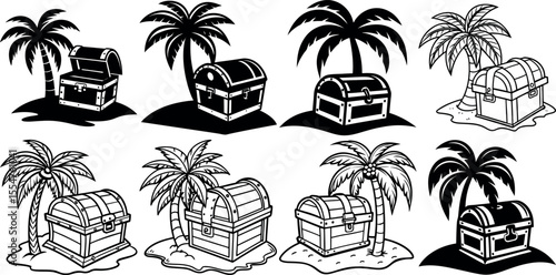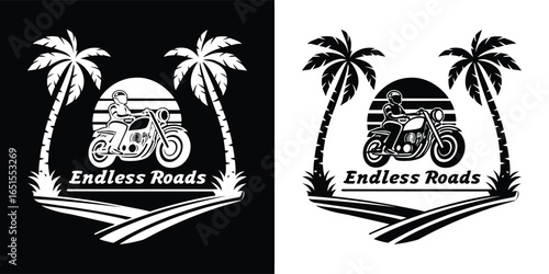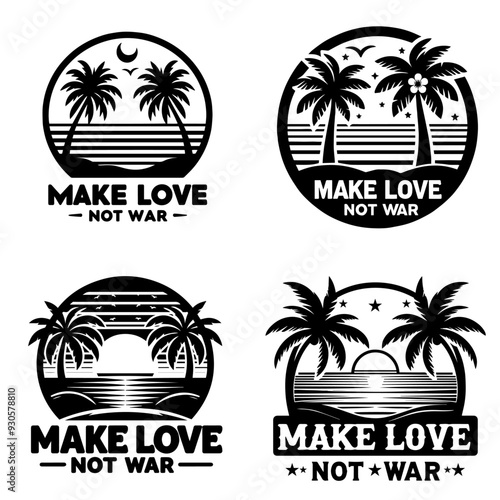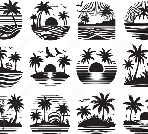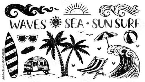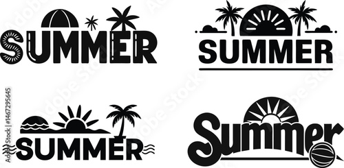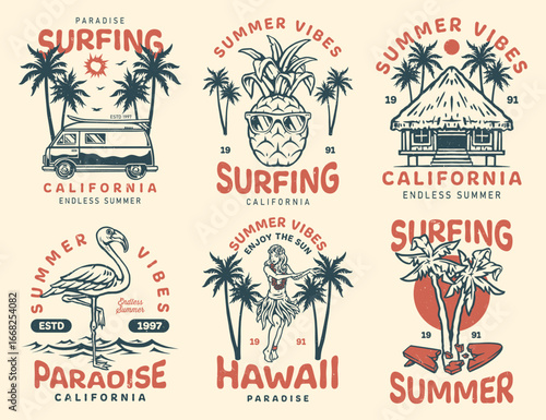 Vector set of summer adventure, beach vacation, night party, surfing vintage logos, emblems, labels and badges. Black and white monochrome illustration in retro style.