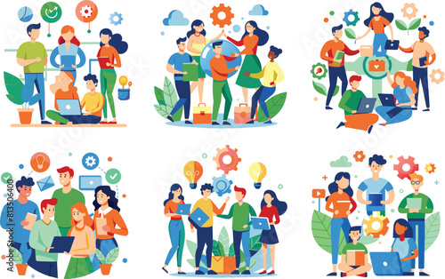 Vector illustration of travelers are photographed with animals at zoo, taking photo of nature, taking selfie. Tourist people symbols, icons isolated on white background. Flat style design.