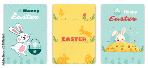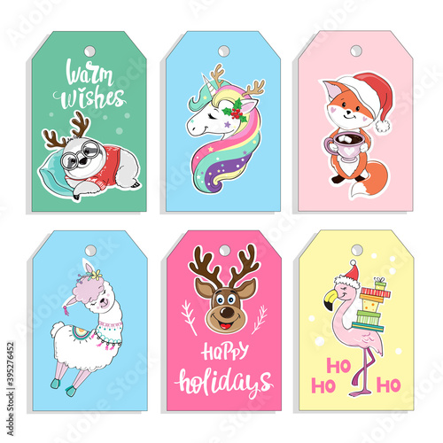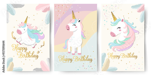 Magic unicorn cards. Vector hand drawn illustration. Greeting, invitation card templates for kids with romantic mythical creature unicorn, rainbows, clouds, hearts and handwritten text.