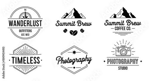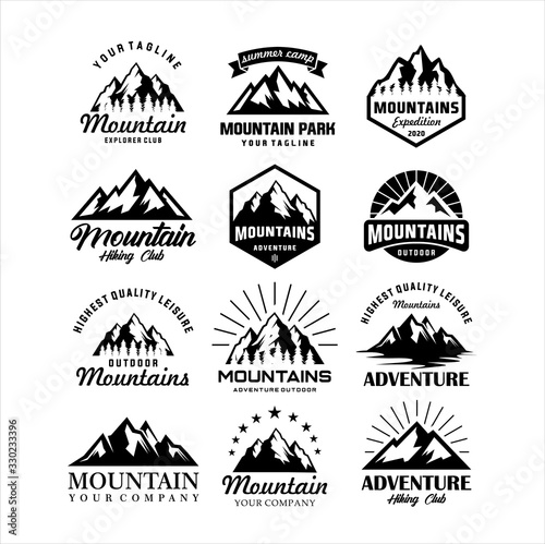 Outdoor label, emblem, badge and logo set, vector monochrome illustration in vintage style. Mountain expedition, journey adventures, camping, mountain trips, kayak tours, forest camp lettering.