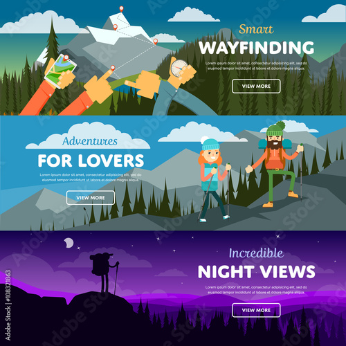 Vector set of winter people activities concept horizontal banners in flat style. Winter games, Help others in winter, Sledging design elements.