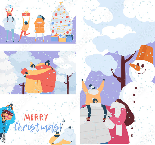 Vector set of winter people activities concept design elements in flat style. Characters sledding, playing snowballs, making snowman and snow angel, clearing car from snow, shopping. Winter cityscape.