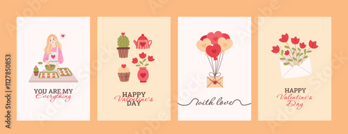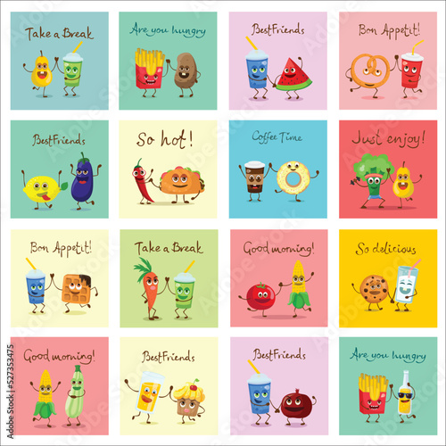 Vector set of winter cards with cute cats and inspirational quotations. Happy kittens in warm knitted hats, scarves and sweaters having fun in winter.