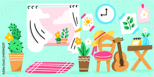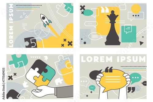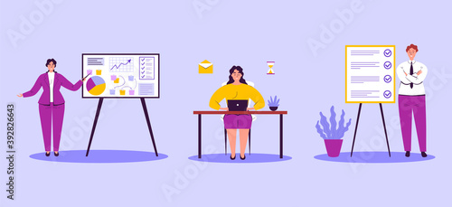 Vector set of workouts for men and women in the gym or fitness studio. Cardio trainings, aerobics, exercises with dumbbells and fitness, sports equipment and training machines. Flat design