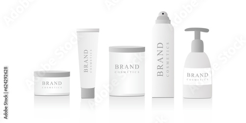 Shaving gel and foam bottles, shaving brush and mug mockups. Vector realistic illustration isolated on white background.