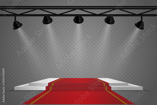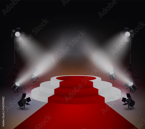 Spotlights and white round stage podium with red carpet. Vector realistic illustration. Red carpet event design element.