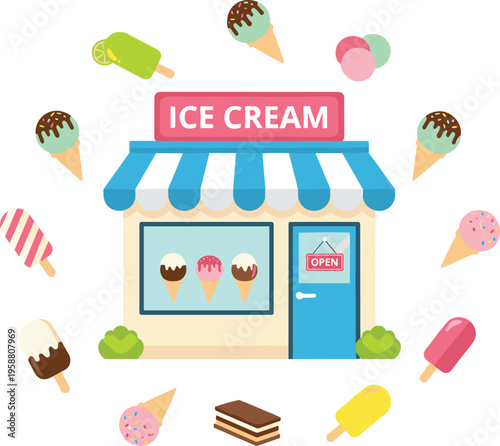 Vector street market with donut snack and sweet drinks assortment illustration. Fast food local shop offering takeaway lemonade, juice and desserts. Small business concept
