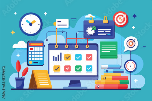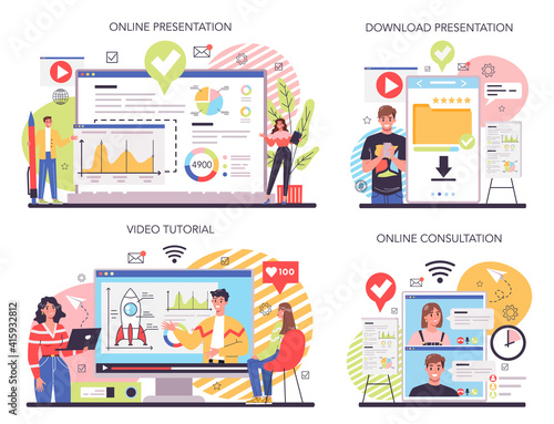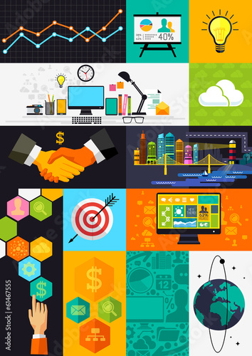 Business analytics poster banner template. Vector thin line art flat style design with office workers funny cartoon characters, business symbols, icons for website banners and printed materials.