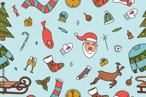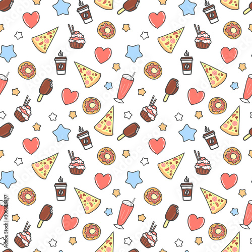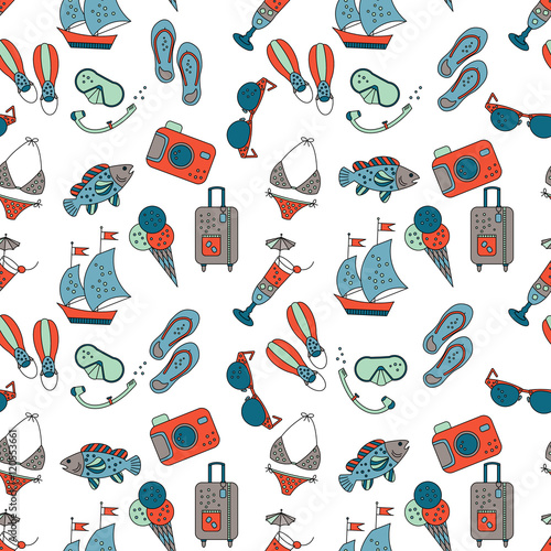 Vector seamless pattern with bbq grilled meat, fish, sauce, chili, beer and grilling equipment. Thin line art flat style design barbeque background, wallpaper.