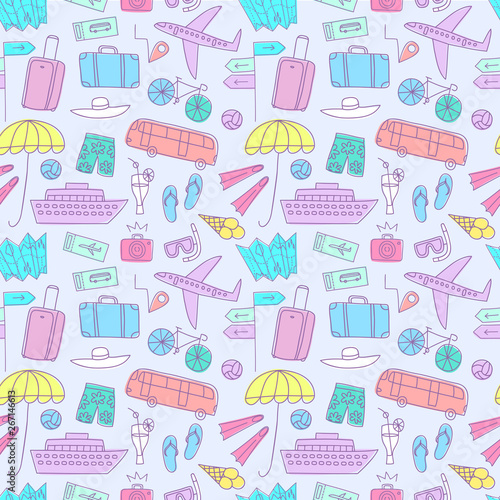 Vector seamless pattern with bedroom interior and furniture. Thin line art flat style design bedroom background, wallpaper.
