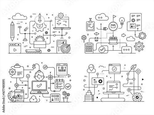 Business poster banner template. Folders, briefcase, safe, achievement, time management, deadline etc. vector thin line art flat style design elements, icons for web banners and printed materials.