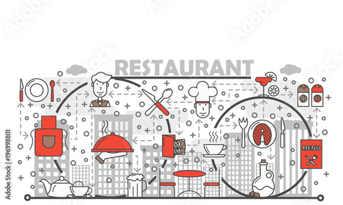 Cooking vector poster banner template. Kitchen appliances, cooking utensils, food, wine thin line art flat style design icons for web banners, printed materials.
