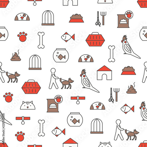 Vector seamless pattern with cat, dog, parrot, fish, pets food, grooming tools and accessories. Thin line art flat style design pets background, wallpaper.