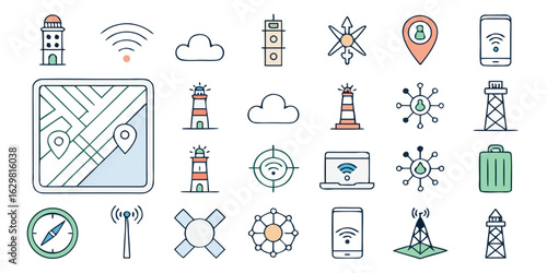 Vector seamless pattern with heavy industry manufacturing, power plant with smoking pipes, mining fossil fuels symbols. Thin line art flat style design production background, wallpaper.