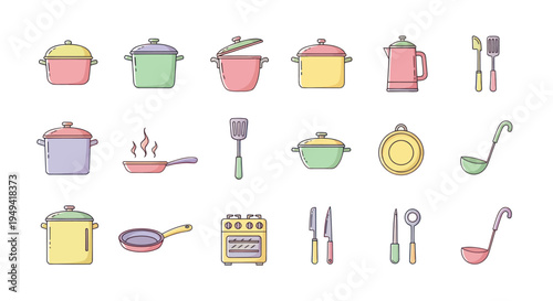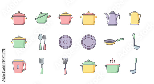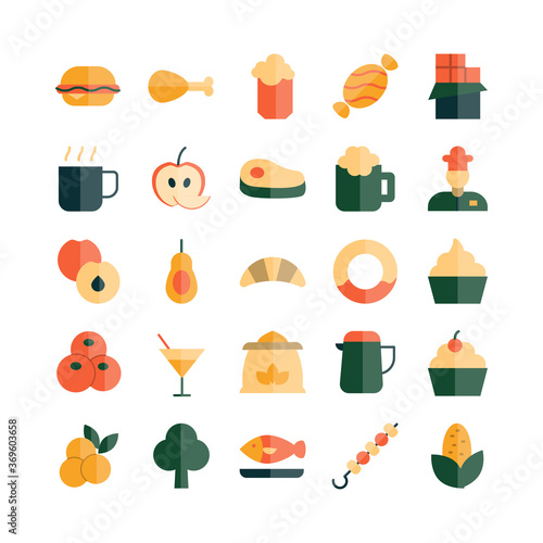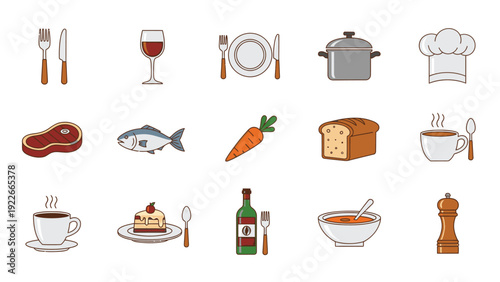 Food and cooking utensils icon set. Vector thin line art flat style design elements isolated on white background.