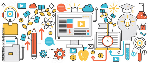Vector seamless pattern with video and cinema production symbols. Thin line art flat style design video background, wallpaper.