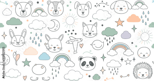 Vector seamless pattern with weather symbols, icons. Thin line art flat style design background, wallpaper.