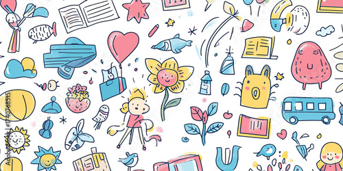 Vector seamless pattern with bear, elephant, zebra, parrot, lion, ice cream cone, bus, camera, visitors, animal food and cotton candy. Thin line art flat style design zoo background, wallpaper.
