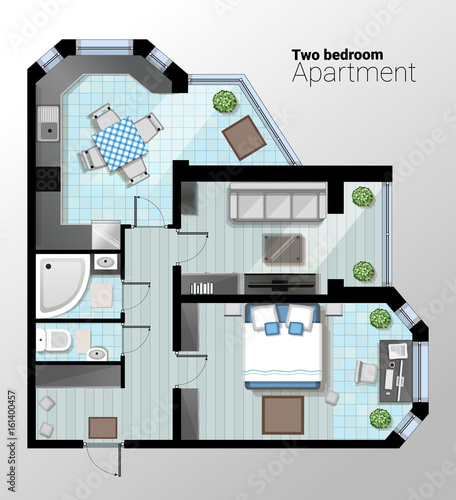 Vector top view illustration of modern one bedroom apartment. Detailed architectural plan of dining room combined with kitchen, bathroom, bedroom. Home interior with comfortable furniture.