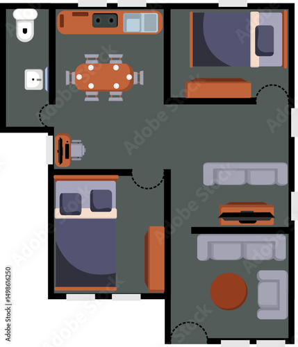 Vector top view illustration of modern one bedroom apartment. Detailed architectural plan of dining room combined with kitchen, bathroom, bedroom. Home interior with comfortable furniture.