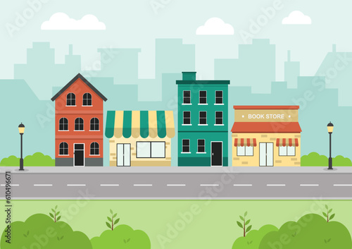 Vector tourist interior poster, banner set with city street, taxi stand, street food kiosk, camping site, gift shop. Flat style design.