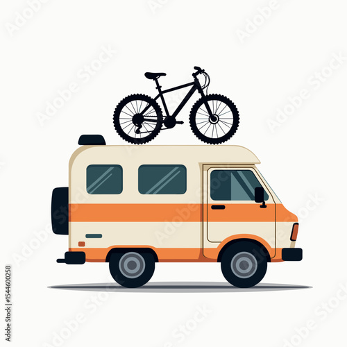 Vector vintage travel poster. Illustration of travel bus and bike standing on it in retro pop art comic style.