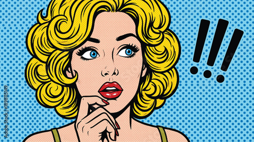Vector illustration of surprised blonde woman and sale lettering. Discounts and sales advertising poster in retro pop art comic style.