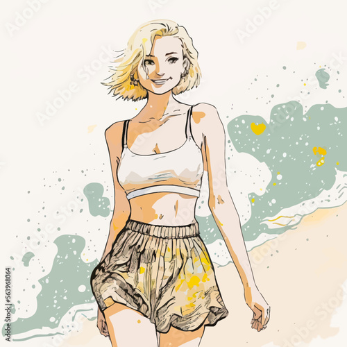 Vector illustration of beautiful young woman holding pearl shell. Smiling summer girl in retro pop art comic style.
