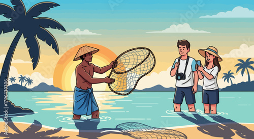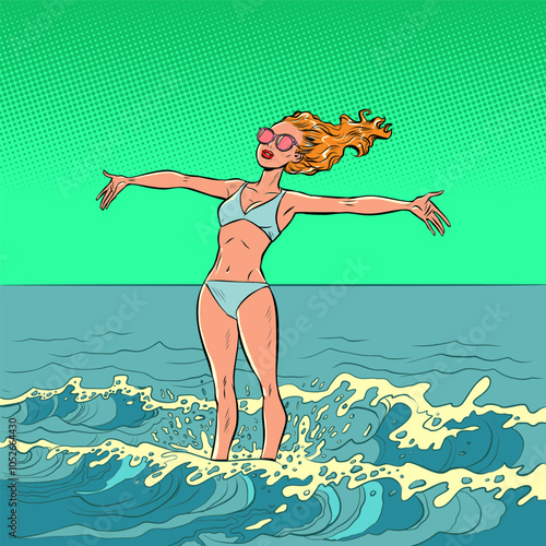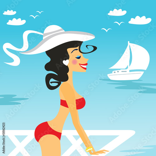 Vector illustration of woman in swimsuit and sun hat relaxing at the seaside. Beach holidays template in retro pop art comic style.