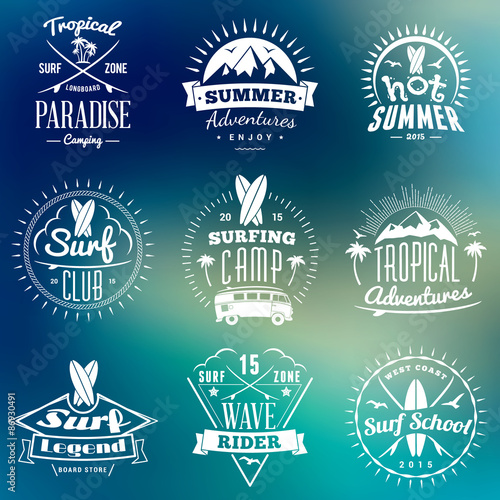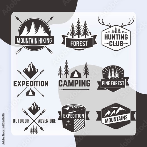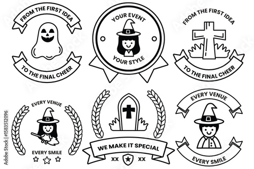 Vector vintage theatre emblems, labels, badges, logo with theatrical symbols such as drama and comedy masks, binoculars, lyre musical instrument, high silk hat, fan, theater scene decorations, etc.