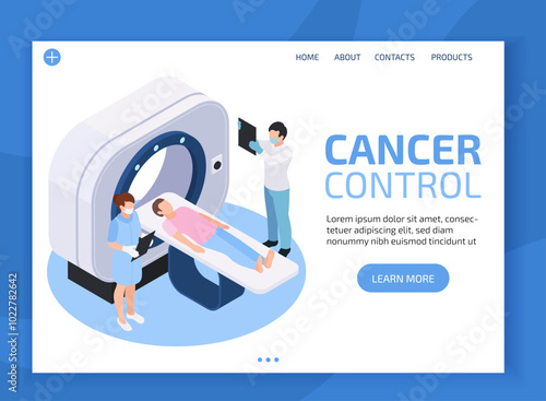 Vector web site linear art design template. Healthcare and medical research. Doctor makes medical check up with MRI tomography. Landing page for website and mobile development