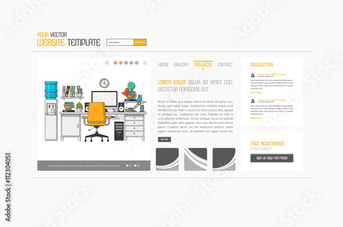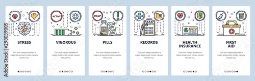 Vector web site linear art onboarding screens template. Business office accessories, printer, desk, chair. Menu banners for website and mobile app development. Modern design flat illustration