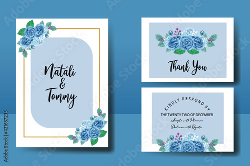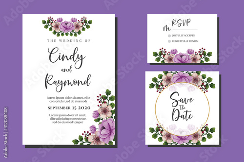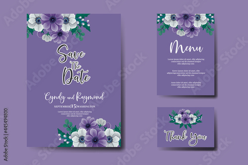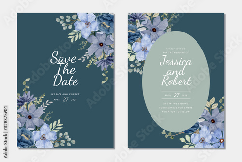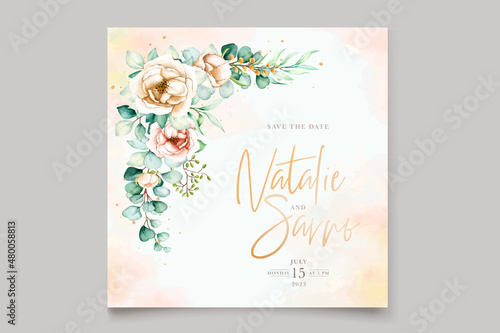 Vector illustration of wedding invitation, greeting card with white peony and forget-me-not flowers. Set of isolated basic parts of plant bud, flower, stem and leaf.