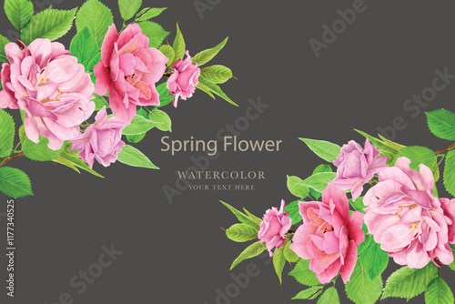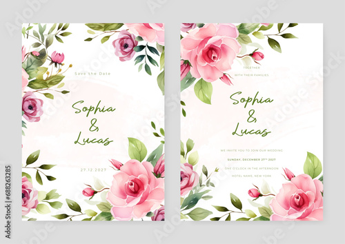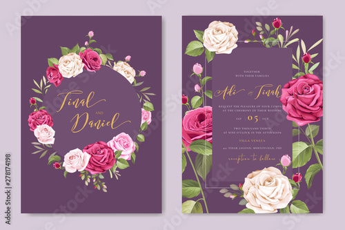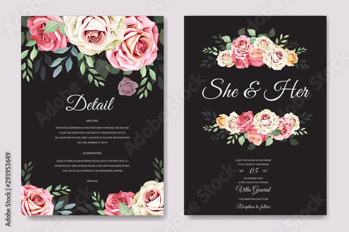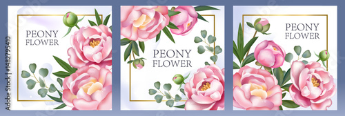 Vector illustration of wedding invitation, greeting card with peony flowers. Set of isolated basic parts of peony plant bud, flower, stem and leaf.