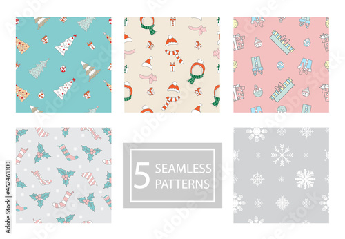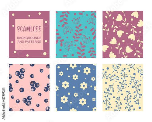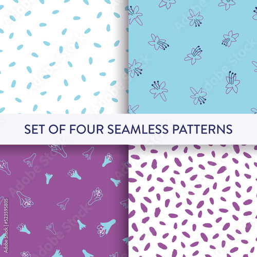 White blank and unicorn bed linen set. Vector top view illustration. Three seamless patterns for kids bedding fabric samples with magic unicorns, balloons, rainbows, string flags, hearts, stars.
