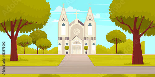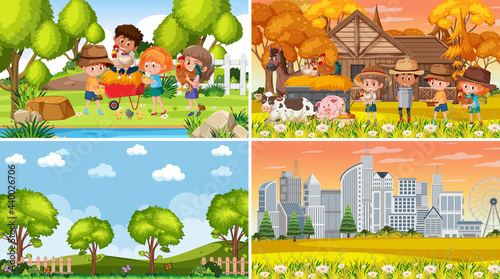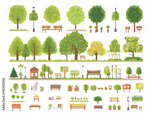 Vector seasonal work in city park illustration. Man worker character caring grass and plant, trimming, cutting and landscaping cartoon background. Volunteer community gardening in urban area