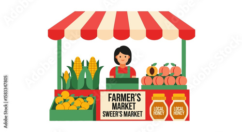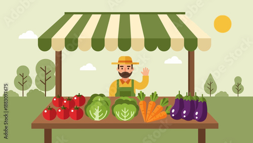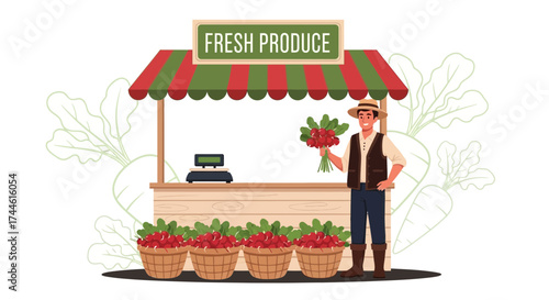 Vector illustration of saleswoman standing at market stall with vegetables. Flat style design.