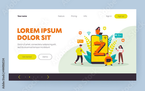 Vending snacks machine vector website template, landing page design for website and mobile site development. People buying snack food from dispenser. Vending machine business and service.