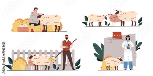 Vet clinic vector illustration set. People with pets visit veterinarian clinic. Veterinary doctor examining dog and cat in vet hospital. Animal medical treatment.