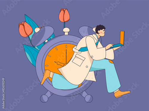 Veterinarian examining dog paper cut silhouette in round creative natural frame vector illustration. Veterinary clinic and healthcare service or domestic animals concept