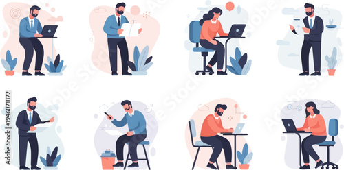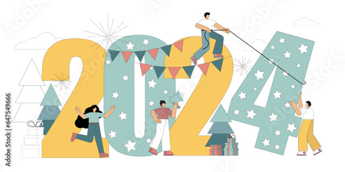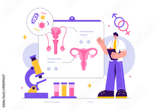 Veterinary clinic services, vector flat illustration. Huge dog and cat, tiny characters vets with syringe, microscope, magnifying glass. Veterinarian pet checkup, animal treatment, medical pet care.